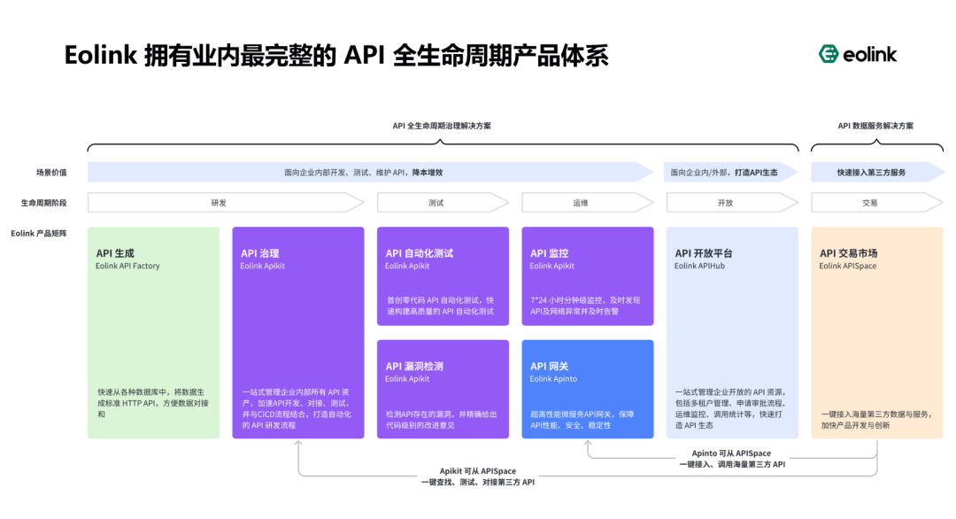 Eolink 是国内 API 整体解决方案的领军企业,致力于打造一站式、智能化的 API 全生命周期解决方案,为企业用户提供完善的 API 规范化治理、API 研发流程优化、API 性能和安全保障、API 数据服务开放及交易等创新服务,帮助企业提升研发效能,降低运维成本。